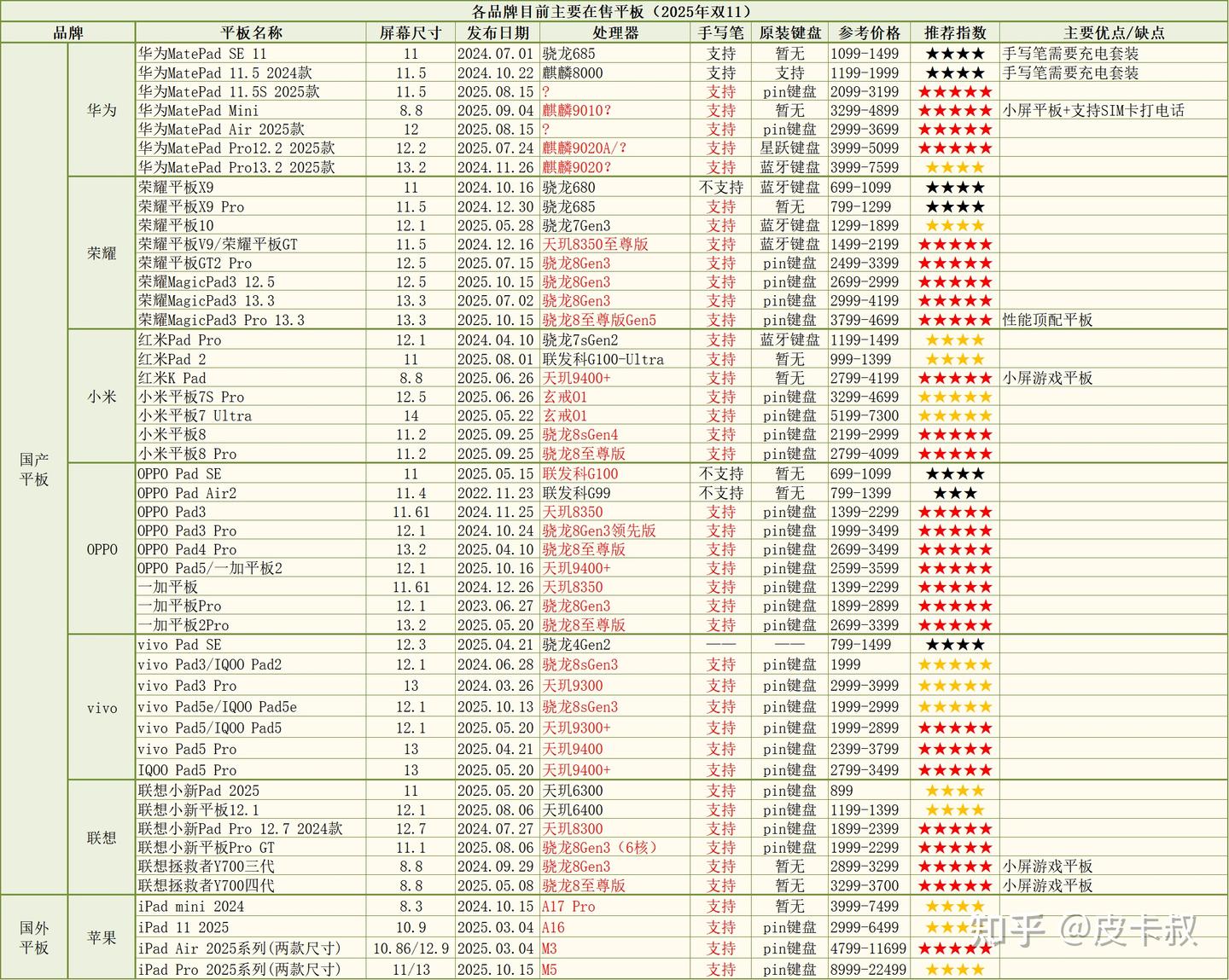 各个品牌目前在售的平板如下图。主要的国产平板品牌有华为、荣耀、小米、联想以及近两年刚加入平板阵营的vivo和OPPO。本篇只介绍下表中比较推荐的部分平板。