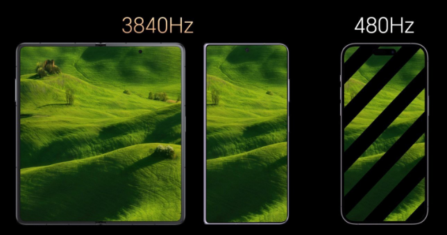 高频PWM调光则比低频PWM调光更护眼,在低亮度环境的色准表现也比较不错。普遍观点认为,当PWM频率超过1250Hz时,一般不会对视力造成显著影响。常见有1920Hz、1440Hz高频PWM调光,2023年多数手机开始出现了2k+Hz高频PWM调光。2024年有不少出现了3840Hz的超高频PWM调光了。