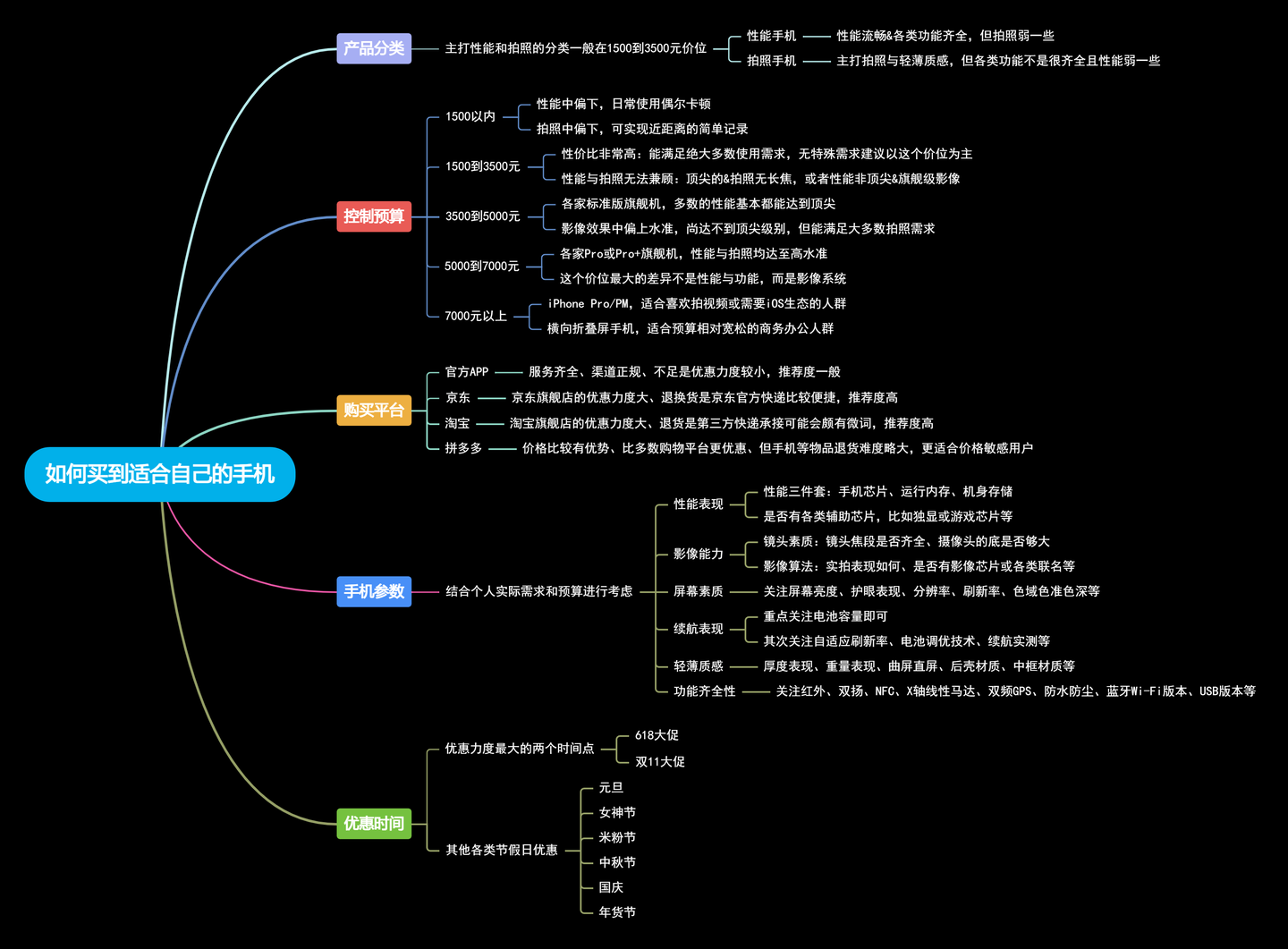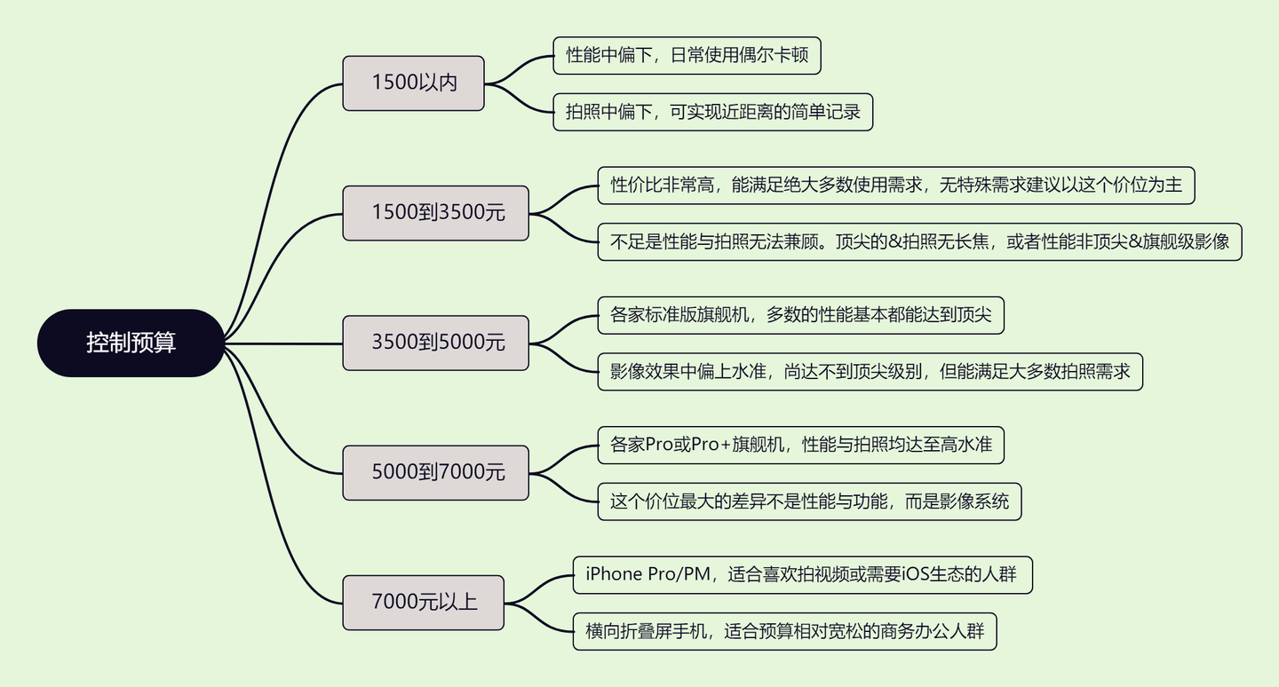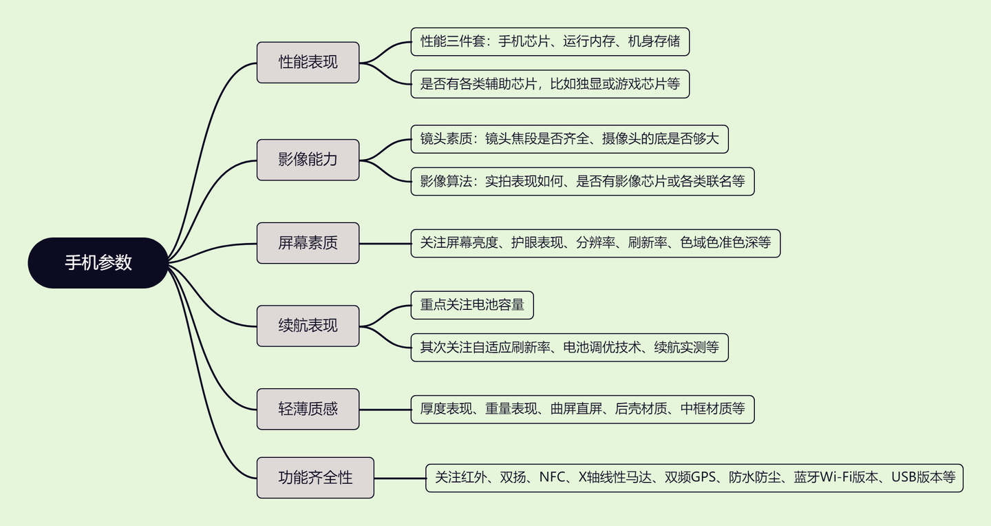 这里我整理了一个思维导图帮助大家更好的理清购机思路,内容包括了以下几个方面。