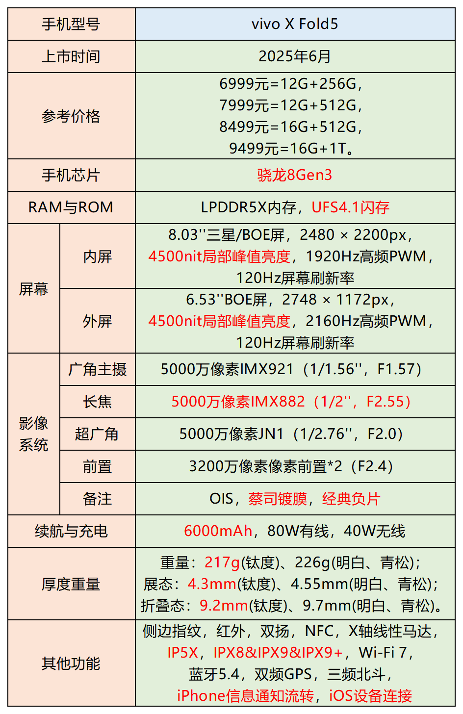 选购建议:vivo X Fold5是当下最值得入手的折叠屏之一,轻薄机身、强劲性能、卓越影像、高效系统交互以及出色的跨生态协同能力,综合体验十分优秀。尤其适合注重手机的便携性、耐用性以及在影像、办公等方面的强大功能的用户。8Gen3芯片日常也完全够用,关键是起售价相当美丽,性价比高。