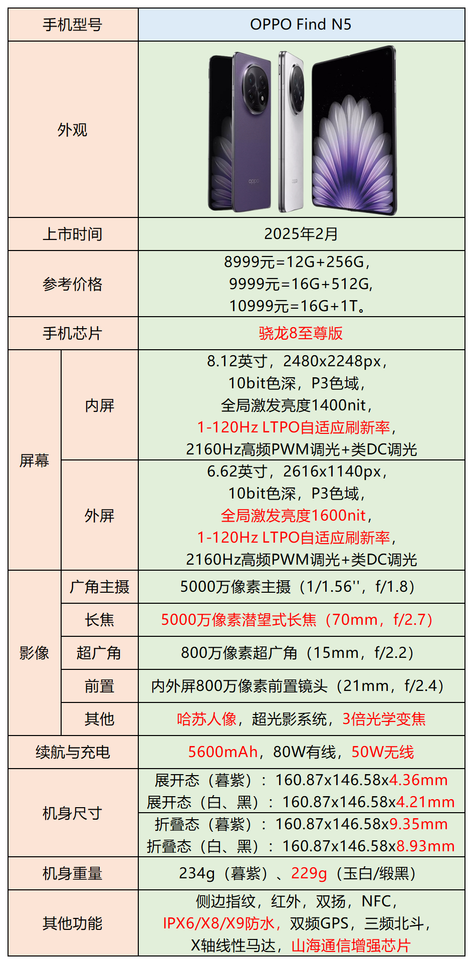 选购建议:OPPO Find N5起售价为8999元,适合追求极致轻薄、长续航和折叠屏生产力的用户。其钛合金铰链、无感折痕和满级防水设计,解决了折叠屏厚重、易损的痛点,适合商务人士或高频出差群体。截止25年2月份,是市面上唯一的骁龙 8 至尊版折叠屏,其性能足够应对日常办公与中度游戏。影像系统支持哈苏调校和长焦微距,不过硬件降级可能会影响一定程度的摄影体验。若预算充足且看重便携性、防水和折叠生态,Find N5 是当前最薄折叠屏中的均衡之选;若追求顶级影像表现,可以对比其他旗舰机型再考虑。