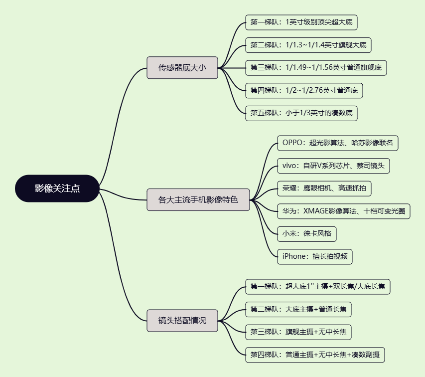 硬件来说最需要关注的是传感器素质,即底大小。目前手机端最大底是1英寸,第二梯队的主摄一般是1/1.3到1/1.4英寸左右的样子。具体来说,如果你比较在意手机的影像素质,那么我建议务必要重点看看下面这个思维导图,相信会很有助于帮助各位购机。