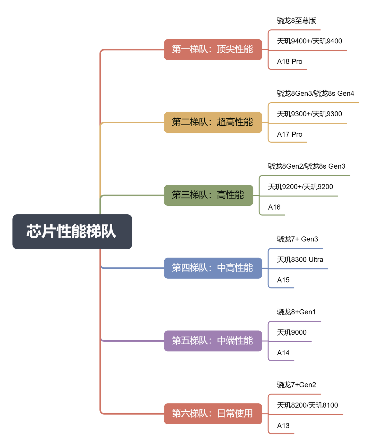 性能铁三角中,最关键的还是看芯片性能。这里我将市面上比较常见的芯片整理出来形成五大梯队,购机时尽量不要选择性能比第六梯队还低的芯片。条件允许尽量选择第一到第三梯队之间的芯片,日常使用流畅,还能比普通芯片的多用一两年。