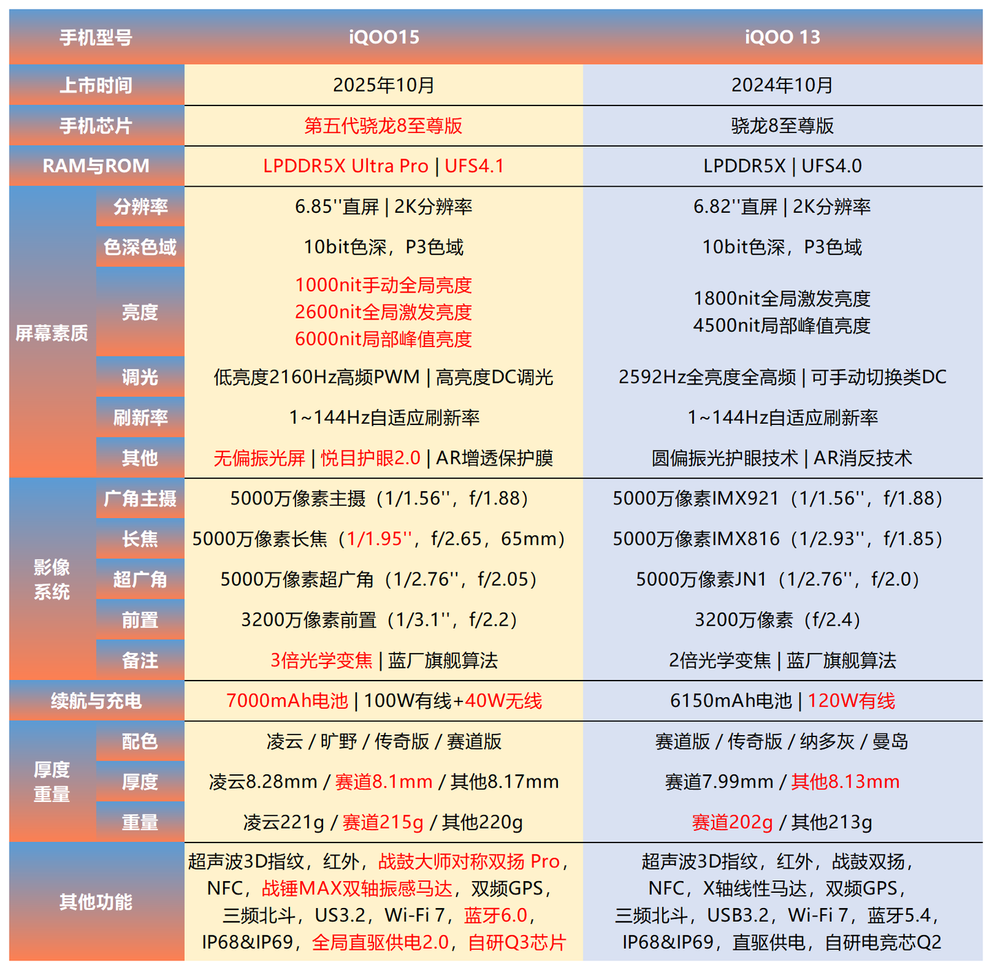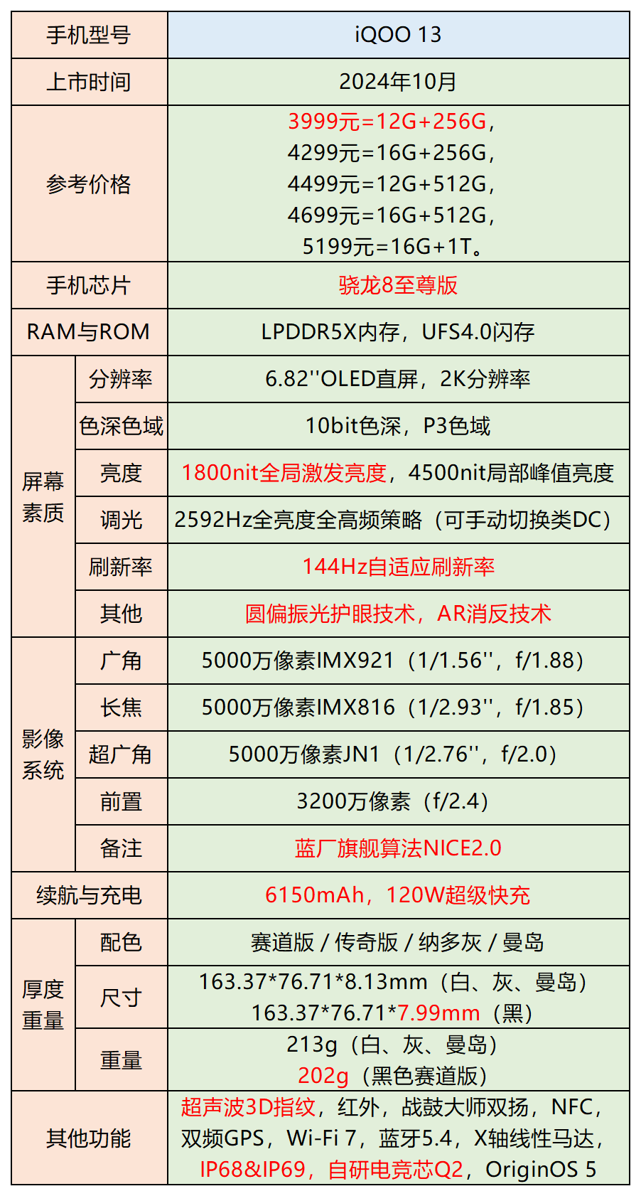 选购建议:iQOO13带来了全新顶级护眼的BOE 2K珠峰屏,补齐了iQOO 13迈向超全能性能旗舰机的最后一块版图。是当下性能党的理想国,也是游戏爱好者的最终归宿。蓝晶×骁龙8至尊版带来了顶级的性能调校,外加全新的OriginOS 5系统加持带来了超丝滑的系统体验;联合BOE推出顶级护眼的2K珠峰屏,非常适合需要长时间看手机屏幕的各类用户群体;续航与快充方面,拥有新一代6150mAh的超大蓝海电池和鲜见的120W超级闪充强强搭配,在续航强大的前提下,带来了30分钟即可充满电的超快速充电体验;影像方面虽然硬件素质小幅缩水,但实测发现iQOO 13在新一代蓝厂旗舰NICE 2.0算法的加持下,依旧交出了一份超预期的答卷。同时,iQOO 13还给性能党带来了颇具特色的氛围灯功能、直驱供电等功能。毫无疑问,这是新一代旗舰机里极具吸引力的优质产品,也是当下性价比极高的一款旗舰机。