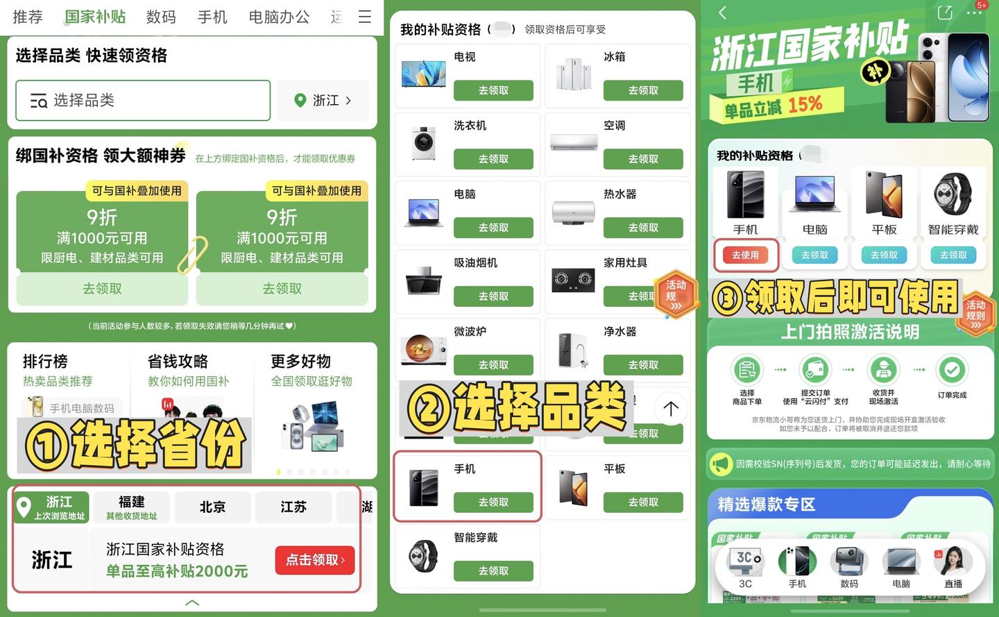 以京东为例(淘宝也差不多一个流程),进入国补频道后,选择省份点击领取。之后在自己感兴趣的类目下,点击领取,之后即可使用。线上购买一般要通过云闪付支付才享受国补。如果是普通方式支付,有可能是直接购买不享受补贴的,这点务必要注意!如果不确定自己是否享受到了国补价格,可尽快在评论区留言让我知晓,讨论如何补救。