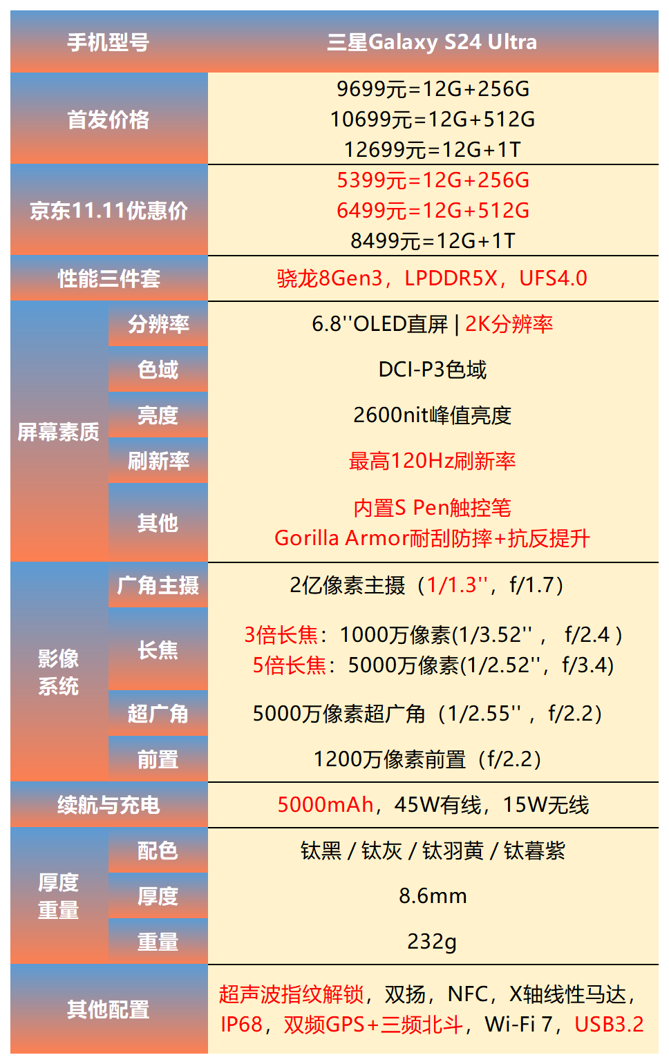 选购建议:三星S24 Ultra适合追求全焦段摄影(尤其长焦需求强)、重视生产力工具(如S Pen、AI笔记/录音转写)以及注重高端质感与屏幕体验的用户。11.11期间5399元起的价格使其性价比凸显,适合摄影爱好者、商务人士或希望“一步到位”的消费者。若对轻薄手感或极限快充有更高要求,需结合不足点权衡;但作为综合体验均衡的机皇级产品,其影像、屏幕及AI功能在同价位仍具独特竞争力。