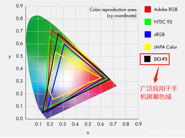 色域就是屏幕所能表现的颜色范围,色域越广,屏幕显示的颜色就越丰富。常见的色域标准主要有:sRGB、NTSC 92、Adobe RGB、DCI-P3、JMPA Color。具体如下图所示,各个色域标准代表所能覆盖的颜色范围大小通过不同颜色的图形覆盖面积即可看到。色域比较垃圾的是黄色的JMPA Color和sRGB,而其他三个都是属于比较优质的广色域。(目前超千元的手机基本都能用上DCI-P3)