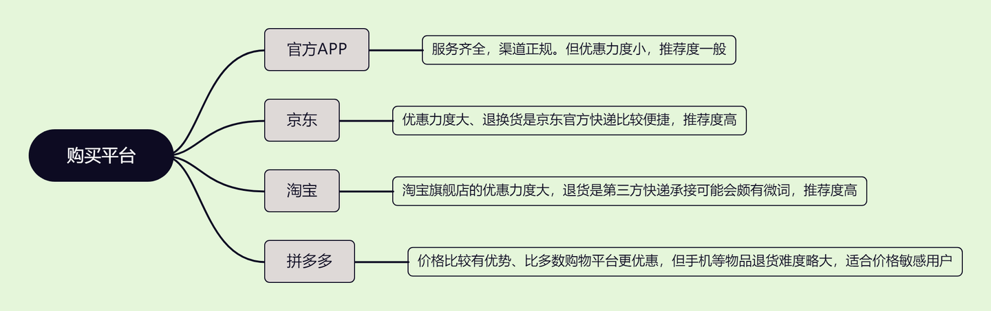 具体选择在哪个平台购买,个人觉得电商三巨头都挺好的,购机时可以适当对比一下价格再考虑。如果搞不懂新机、准新机和二手机的区别,也搞不懂很多弯弯绕绕的,可以直接在京东和淘宝的官方旗舰店购买。稳妥性较高。