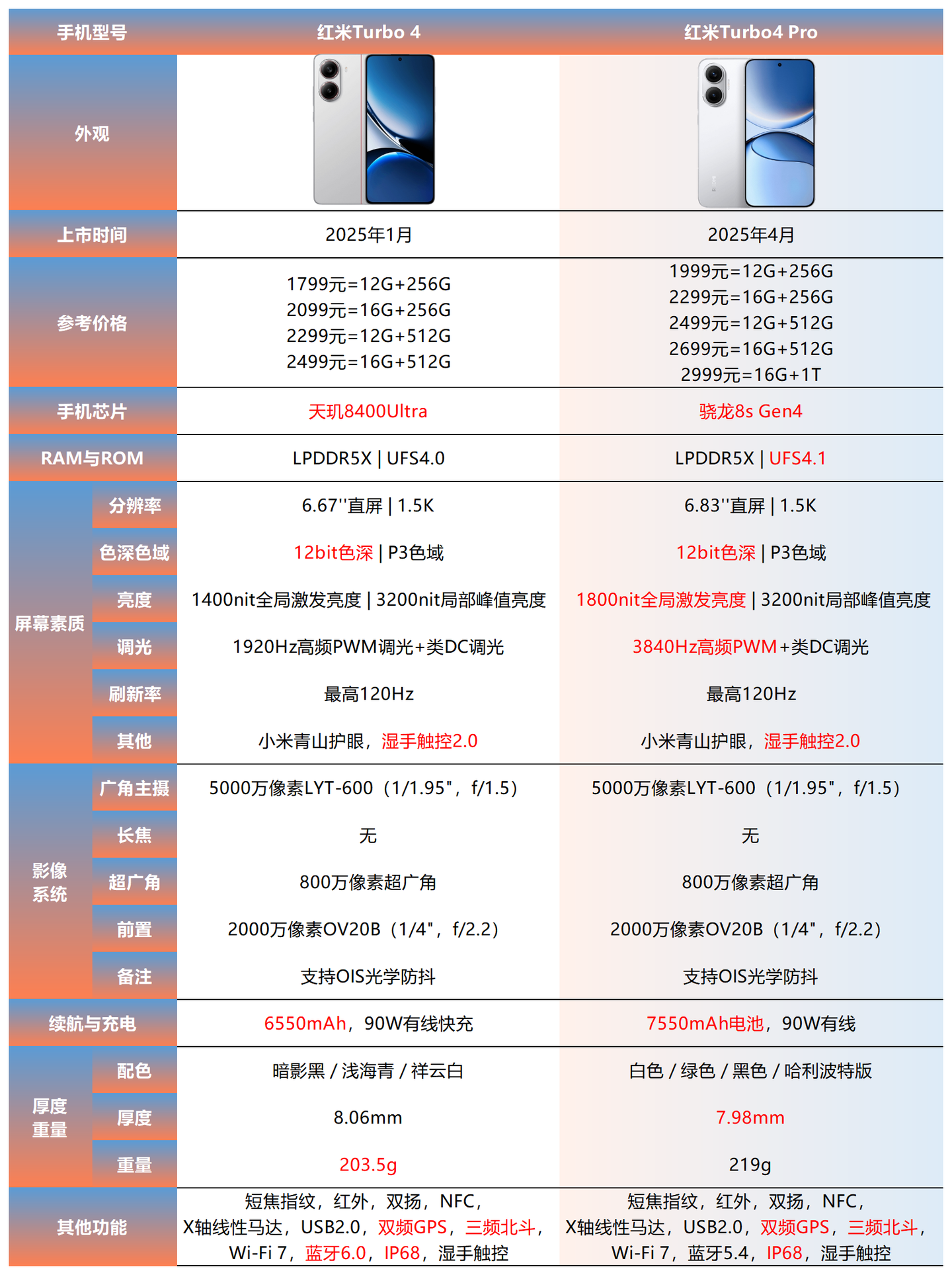综合来看,如果你是重度手游爱好者,追求极致的游戏帧率和快速的回电速度,iQOO Z10 Turbo Pro是更专精的选择;若更看重超长续航、旗舰级机身材质和全面防护能力,那么红米Turbo4 Pro的综合体验也很棒。
