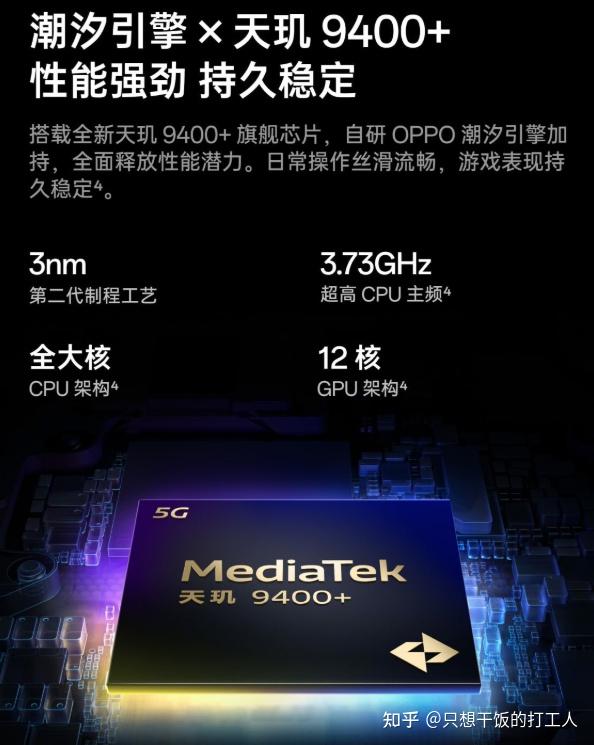 天玑 9400 基于台积电 3nm 工艺,采用第二代全大核 CPU 架构,由 1 颗 3.35GHz 的 Cortex-X4 超大核、3 颗 3.1GHz 的 Cortex-A720 大核及 4 颗 2.85GHz 的 Cortex-A520 小核构成,多核性能出色。GPU 为 Immortalis G9 系列,图形处理能力强且能效佳,同性能下比骁龙 8 Gen3 功耗低 40%,光追能耗比提升 52%,游戏体验好。集成第六代 APU,AI 性能助力影像优化。芯片成本 155 美元,适配 2000-6000 元机型,性价比高。不过,单核约 2900 分,比骁龙 8 至尊版低 15%。搭载机型有 vivo X200、OPPO Find X8 系列等。
