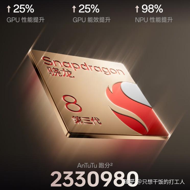 骁龙 8 Gen3 基于台积电 4nm 工艺打造,CPU 由 1 颗 3.3GHz 的 Cortex-X4 超大核、5 颗 2.8GHz 的 Cortex-A720 大核与 2 颗 2.0GHz 的 Cortex-A520 小核构成。在性能跑分方面,其安兔兔综合跑分成绩可达约 200 万分,CPU 性能提升明显,全新架构令单核、多核性能均表现出色,Geekbench 6 单核跑分约 2200 分,多核超 6000 分,多开 APP、运行大型程序都流畅。GPU 集成 Adreno 750,图形处理能力显著升级,游戏画面更逼真流畅。网络方面,支持 Wi-Fi 7 与蓝牙 5.4,网络快且稳,玩在线游戏能降低延迟。常见于红米 K80、IQOO Neo10、一加Ace 5、荣耀GT 等机型。