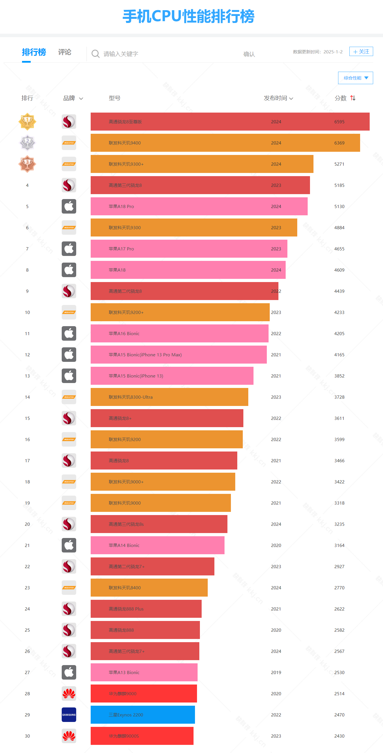 当前安卓各品牌旗舰机骁龙8 至尊版和天玑9400为最强,其次到骁龙8 Gen3、天玑9300、骁龙8 Gen2、天玑9200+;苹果移动处理器更新到A18Pro。
