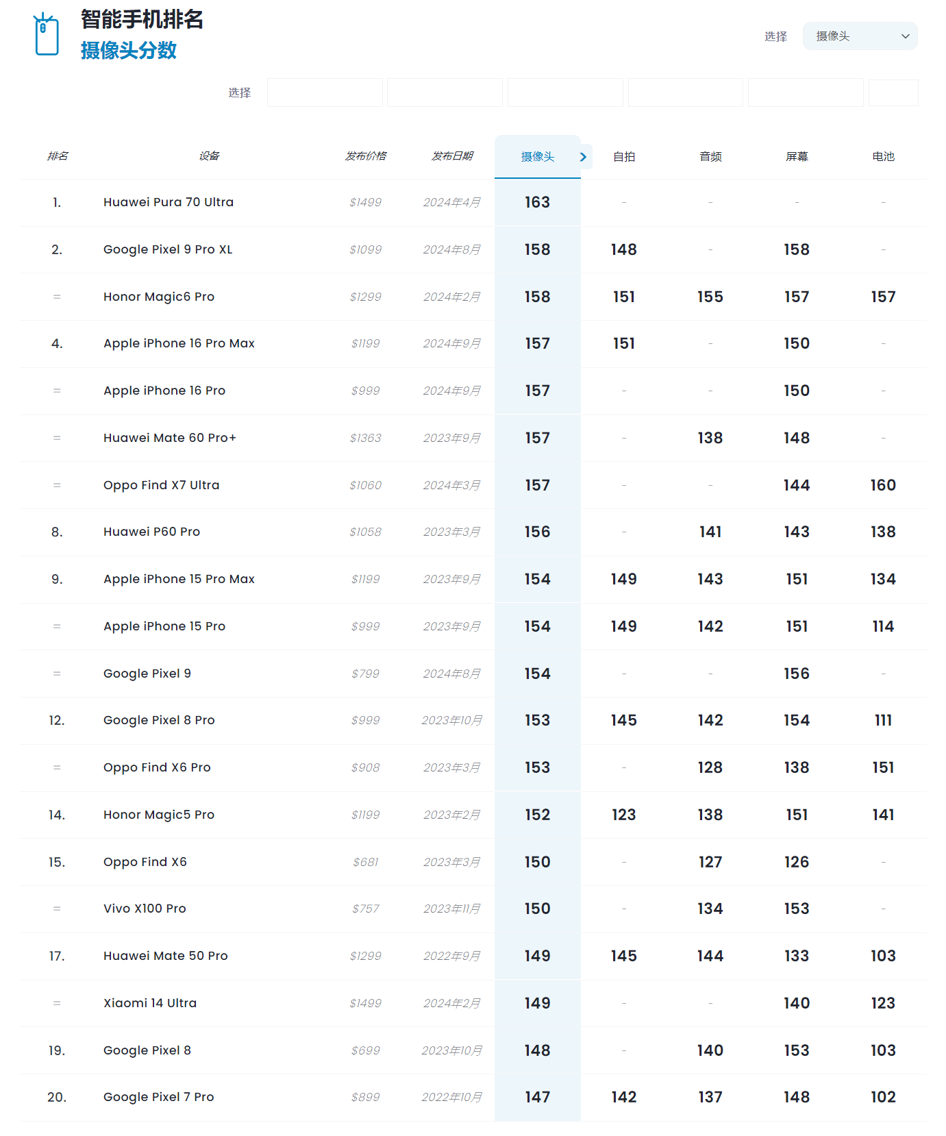 (具体的手机综合照相性能排行可以参考dxomark官网的数据,没上榜的一些旗舰手机不代表拍照能力弱,只是没有送测)