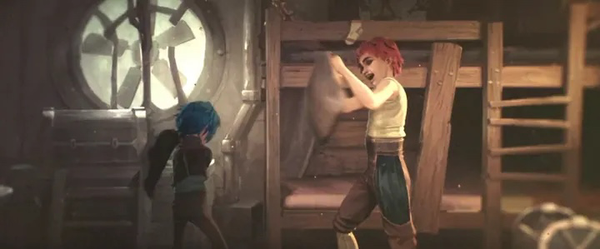 蔚和金克丝住的环境中之简陋,玩闹方式也是砸枕头,可见祖安生活条件的困难。