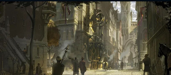 皮尔特沃夫的新建筑端庄优雅地融合了光滑的大理石、青铜栅格和亮闪闪的玻璃,而错落比邻的旧建筑则是粗糙石块和老旧木材的结构。一座座镶着金银纹理的塔楼伸向天空,一座座拱形桥梁横跨于裂谷两侧悬崖的顶端。