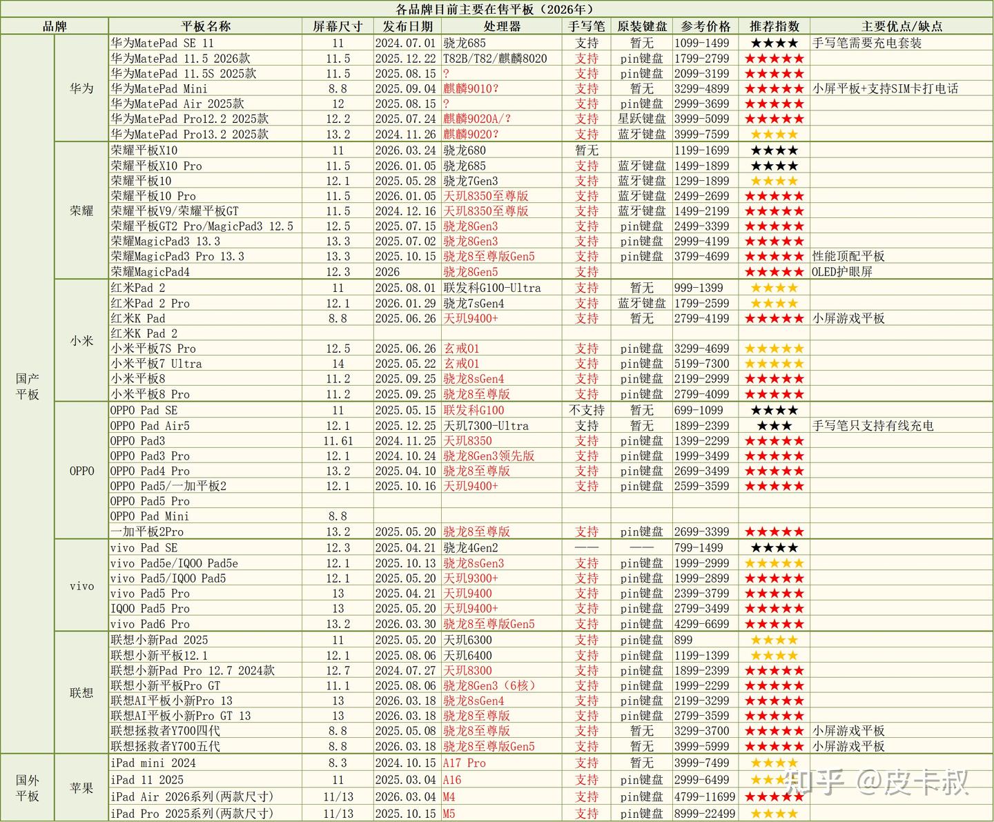 各个品牌目前在售的平板如下图。主要的国产平板品牌有华为、荣耀、小米、vivo、OPPO、联想等。本篇只介绍下表中比较推荐的部分平板。