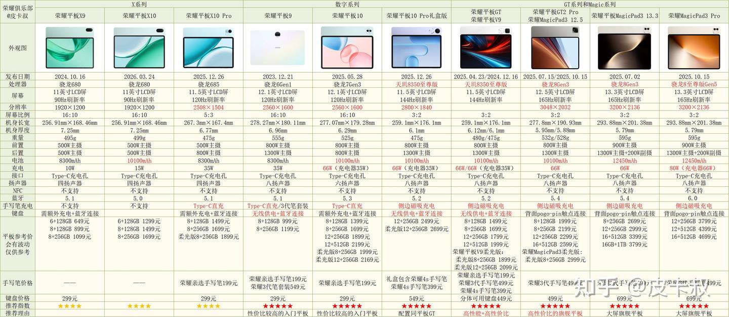 荣耀平板GT、平板V9、平板10Pro三款平板的配置基本一样,算是没有短板的平板。搭载天玑8350处理器,性能不错,支持66W快充。总体上还是不错的。支持给手写笔磁吸充电。