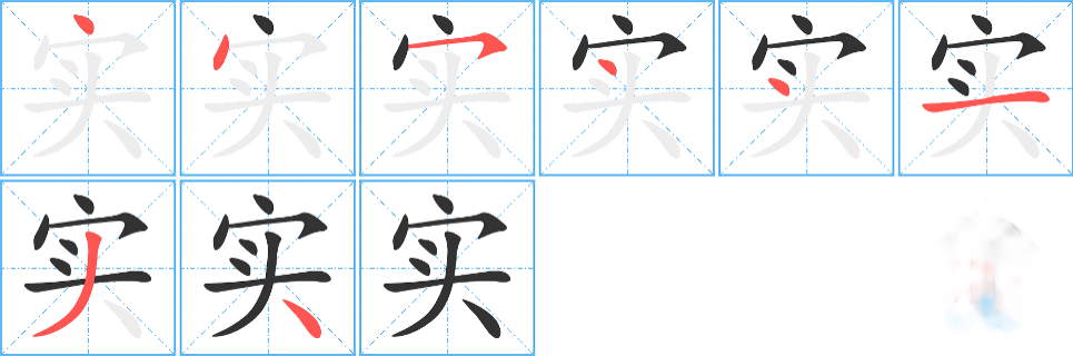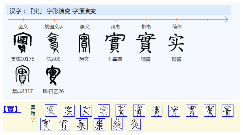 上图金文二例,均由“宀”、“贯”二字构成。从宀,示屋舍府库之义。从贯,田之后起字,示财物。所从贯,其绳两端下垂。会二字得充实之义。第1例所从贯,“田”中点两小点,冗文。战国文字二例,首例从宀、从贯,上体“毌”形变异为“贝”;第2例承自金文第2例。篆文承自战国文字第2例。隶书承自篆文,楷书沿之而定体。在六书中属于异文会意。规范字作“实”至今。 [4]