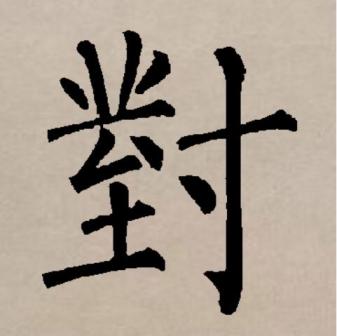 对(拼音:duì)是汉语一级通用规范汉字(常用字) [1]。此字始见于商代甲骨文 [2],基本义指回答、应答。由应答双方引申出敌对、对立,也引申为成双的、配偶,还引申为核对。对又引申作量词,表示成双的人或物。对又用作介词。现代汉语的对还表示正确,与错误相对而言。