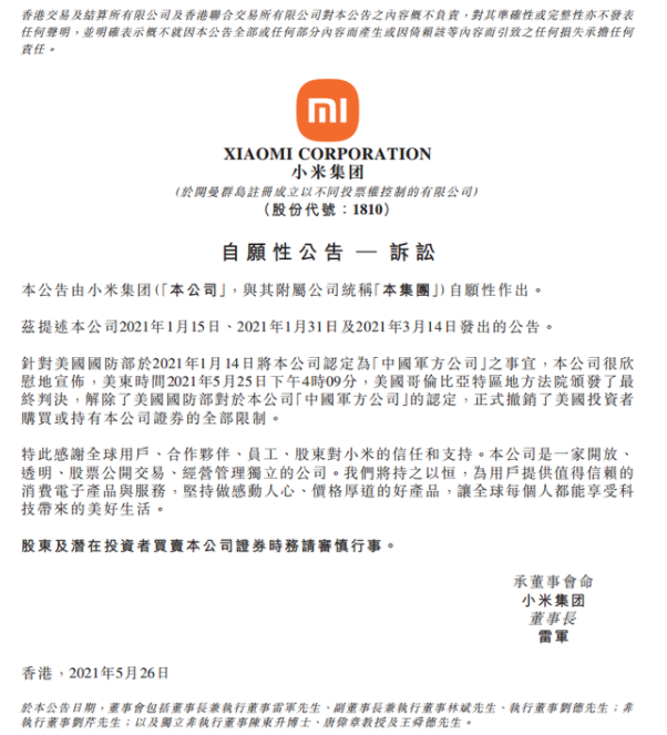 2025年5月13日,小米法务部发文称,关于公司诉聚好看科技股份有限公司商业诋毁一案,特此作如下声明:2023年8月31日,法院做出一审判决,法院认为:聚好看公司通过其微博账号“Vidda官方微博”发布侮辱、贬损小米公司的虚假信息和误导性信息,损害了小米公司的商业信誉和商品声誉,构成商业诋毁。法院判令:聚好看公司在“Vidda 官方微博”账号置顶位置,连续七日刊登声明,消除影响,另赔偿小米公司经济损失及合理开支共计55万元。近日,我司收到法院终审判决,驳回聚好看公司的上诉,维持原判。 [1170]