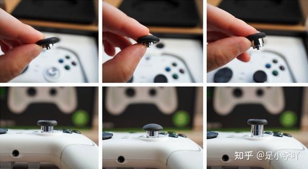 摇杆部分提供了圆顶和加高的两个摇杆帽,采用磁吸设计,垂直向上拉出即可替换。可惜官方只送了2个,左右摇杆不能同时更换,还是希望官方能够多送一组,实现左右对称。上图中自左到右依次为标准摇杆帽、圆形摇杆帽和加高摇杆帽。