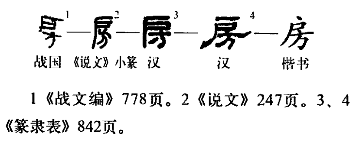 房,形声字。方,既是声旁也是形旁,表示旁边。房,篆文(图2)=(户,屋子)+(方,旁侧),表示正屋的两旁。《说文》:“房,室在旁也。从户,方声。”本义指正室左右的屋子。古代妻住室,妾住房。《书·顾命》:“胤之舞衣、大贝、鼖鼓在西房。”泛指住人或放东西的建筑物。《庄子·知北游》:“无门无房,四达之皇皇也。”引申为形状像房的东西。家族的不同分支有不同的住所,房又指家族的分支。还可指官署单位名。《北史·柳庆传》:“君职典文房,宜制此表。”又作星名。二十八宿之一,东方苍龙七宿的第四宿,有星四颗。 [2] [5]