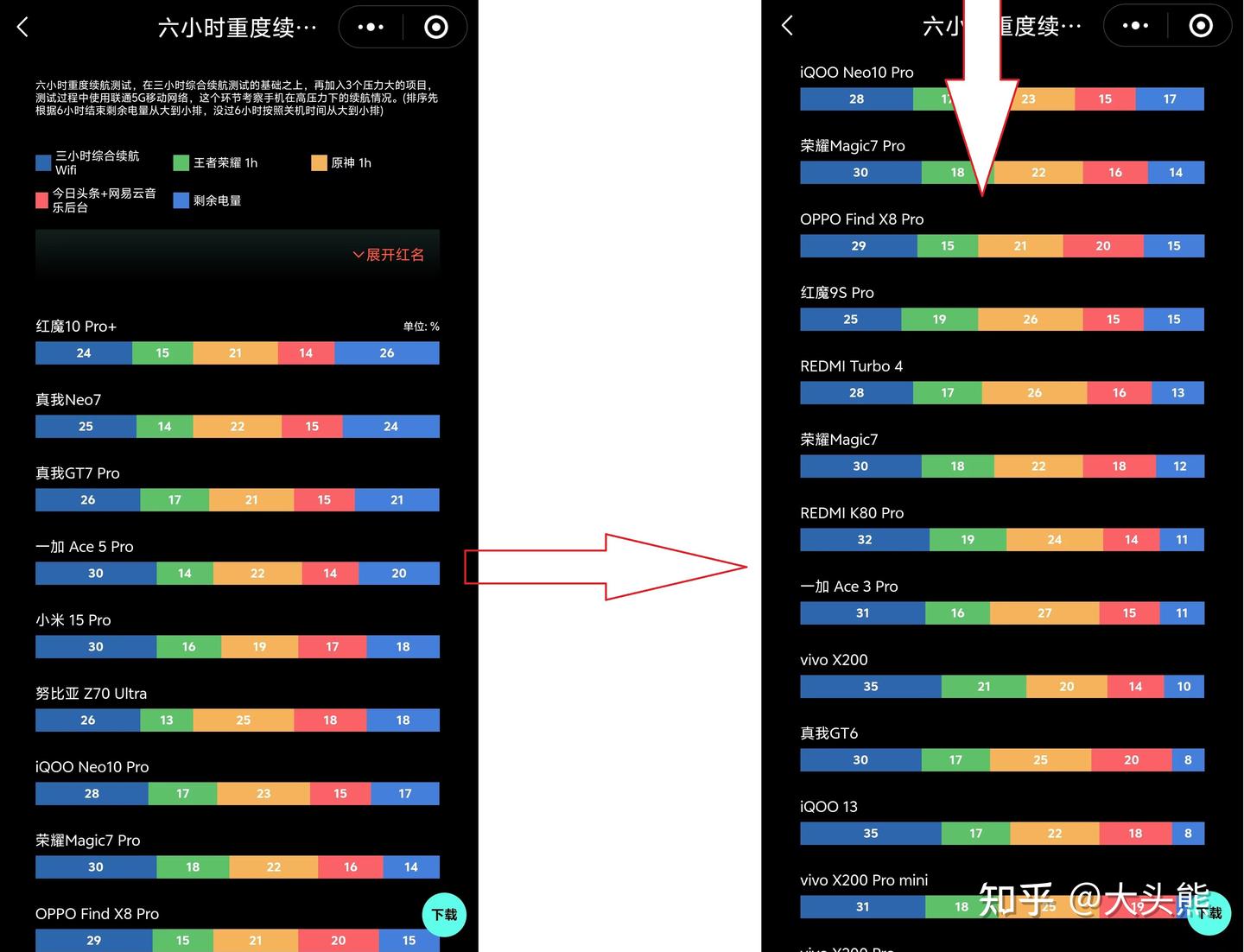 既然是推荐续航强的手机,也没有要求价格要素。这里就以小白测评的续航数据,取六小时重度续航测试榜单前列的手机。其续航测试条件为:WiFi条件下三小时测试半小时吃鸡、视频播放、微信视频通话、购物软件+网易云后台、微博、抖音,之后在联通5G网络下分别进行一个小时王者、原神和今日头条+网易云后台,剩余电量排名。