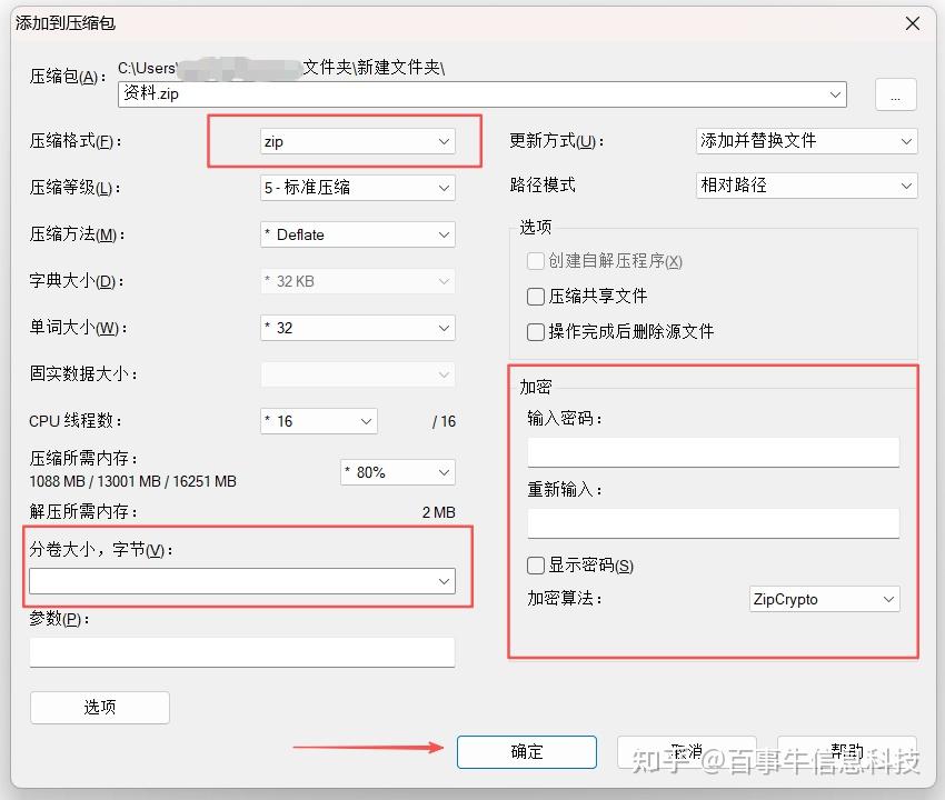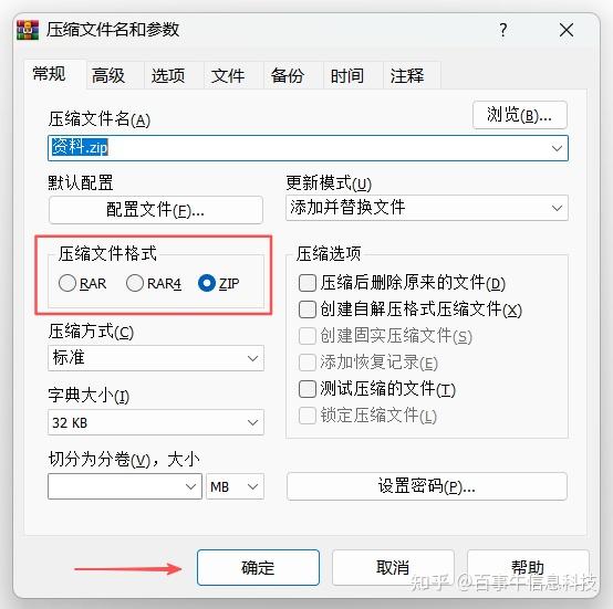 2、弹出对话框后,压缩格式选择“ZIP”,然后点击【确定】即压缩成功。你也可以根据需要,在加密区设置密码,或者点击【分卷大小,字节】进行分卷压缩。