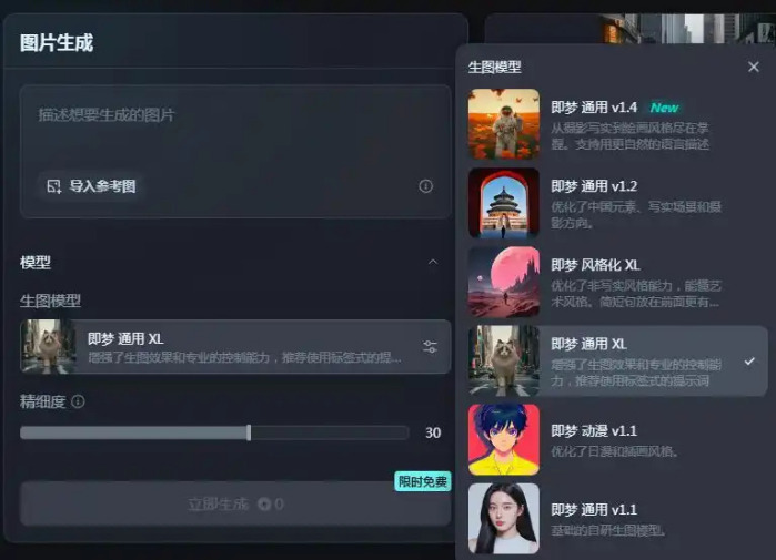 2024年5月9日,剪映Dreamina官方宣布其品牌正式更名为中文“即梦”,同时其AI作图和AI视频生成功能已全量上线。即梦提供了6个图片生成模型,其中最新推出的通用1.4模型优化了中国元素、写实场景和摄影方向。视频生成支持上传首帧或尾帧图片,增强可控性。 [24]