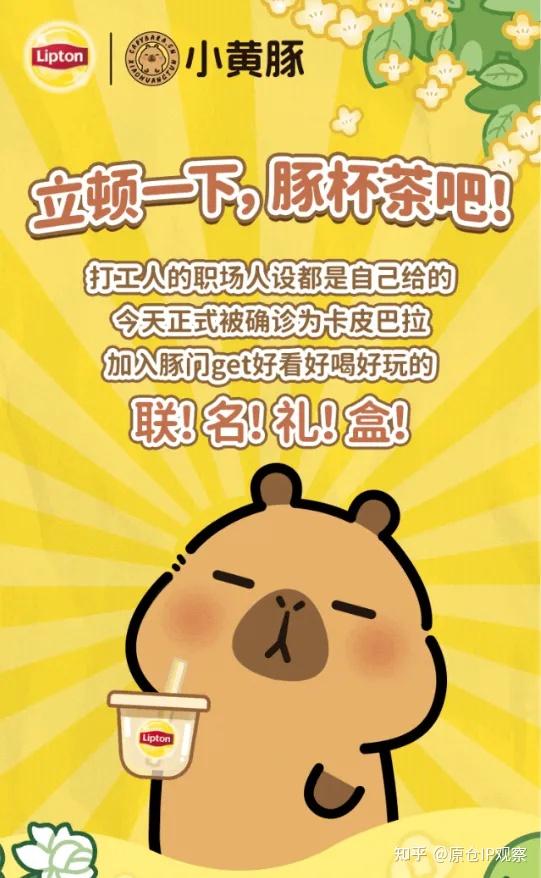 如与蒙牛旗下的风味奶系列产品品牌奶特的合作就包括各类型联名周边、限定礼盒等,与知名茶叶品牌立顿合作除了包含联名周边、限定礼盒,还有定制表情包,在3C领域也与Oppo Reno 13发布了小黄豚联名礼盒。