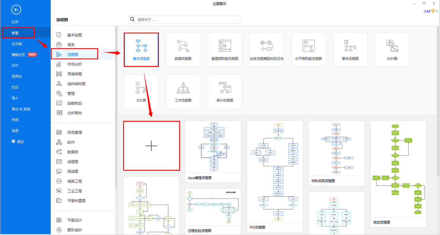亿图图示:如何用流程图描述算法?第二步,打开亿图图示,依次选择“新建>流程图>基本流程图>+”,新建一张空白画布;