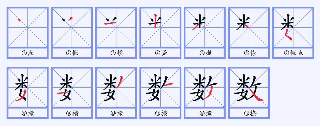 数(拼音:shù、shǔ、shuò)是汉语一级通用规范汉字(常用字) [4]。此字始见于战国文字 [2],产生时代可能更早 [3]。“数”本义是查点、统计,引申指列举过错,加以惩罚,如:数落;又引申指比较起来最突出的,如:数一数二;表示以上动词意义时,均读作shǔ。数又读作shù,表示数目的意思,用作名词;又引申指计算、量化的符号,如数码、数字;又引申指不确定的约数,如数次、数年。数又读作:shuò,表示频繁的意思,用作副词。 [14]