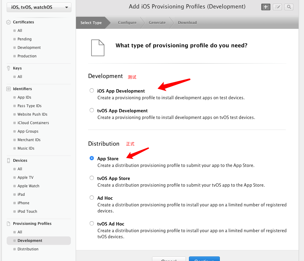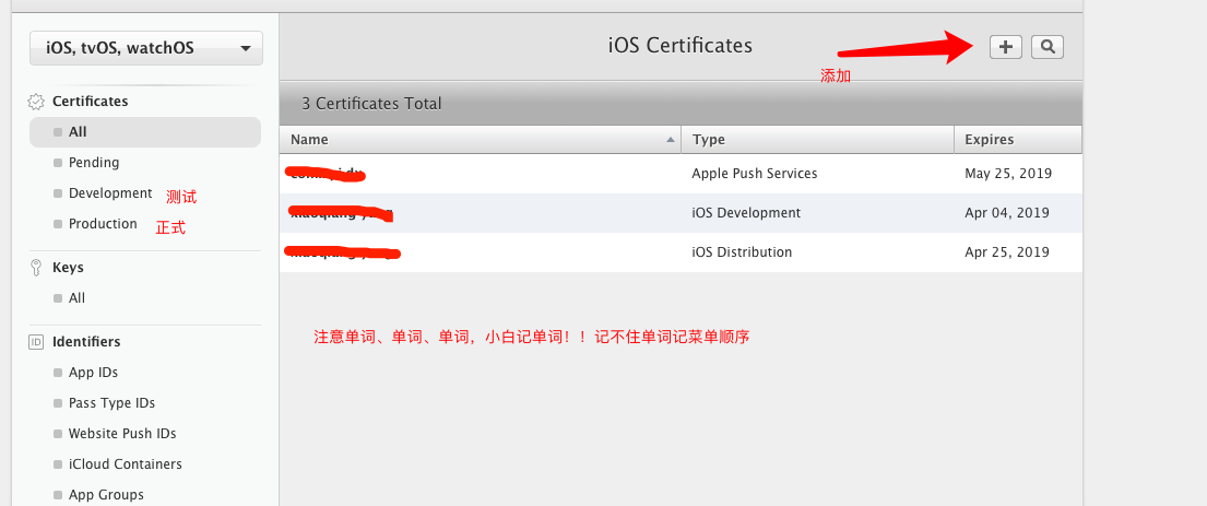 苹果证书分测试证书和正式证书 ,使用上有区别的!!!!!!重点!!!!