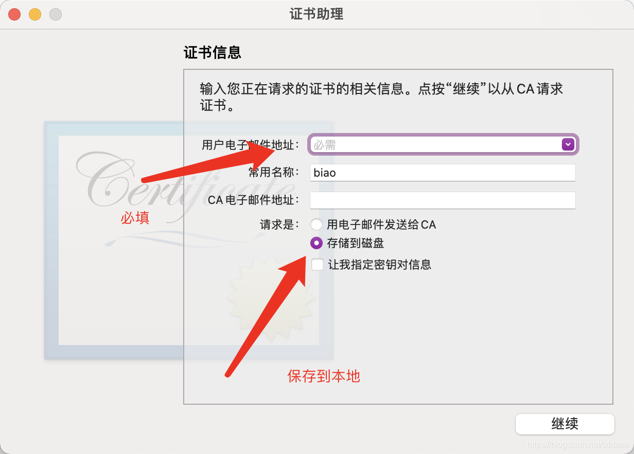 在左上角点击钥匙串访问,在菜单中选择证书助理,再选择从证书颁发机构请求证书
