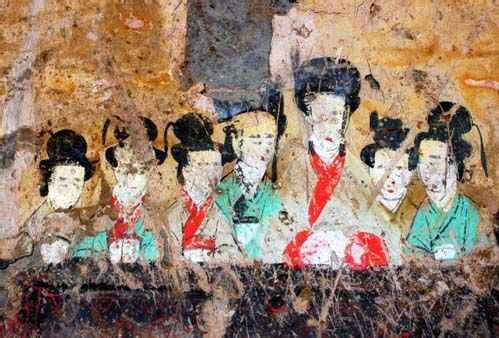 西汉末年到新莽时期,墓室内绘制的壁画的面积增大,增入了世俗生活宴乐的内容。墓例有洛阳金谷园和偃师辛村的新莽墓,金谷园墓前室穹隆顶在白地上以朱墨等色满绘彩云,四壁影作枋柱,以象征木结构建筑。后室顶脊及柱头斗子间分绘日月神灵异兽。辛村墓则除日、月及辟邪画面外,其最有名的有《壁画宴乐图》与《西王母图》。并且绘有多幅门吏、庖厨、宴饮、六博等世俗生活的画面。 [66]