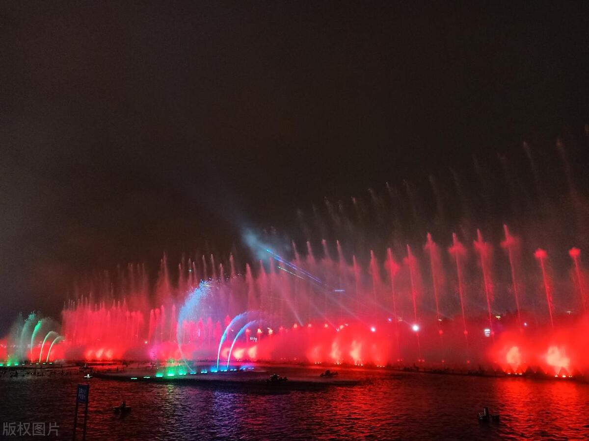 音乐喷泉表演时间:第一场19:30-19:45;第二场20:30-20:45。节假日可能加场,但遇到恶劣天气也可能暂停开放。
