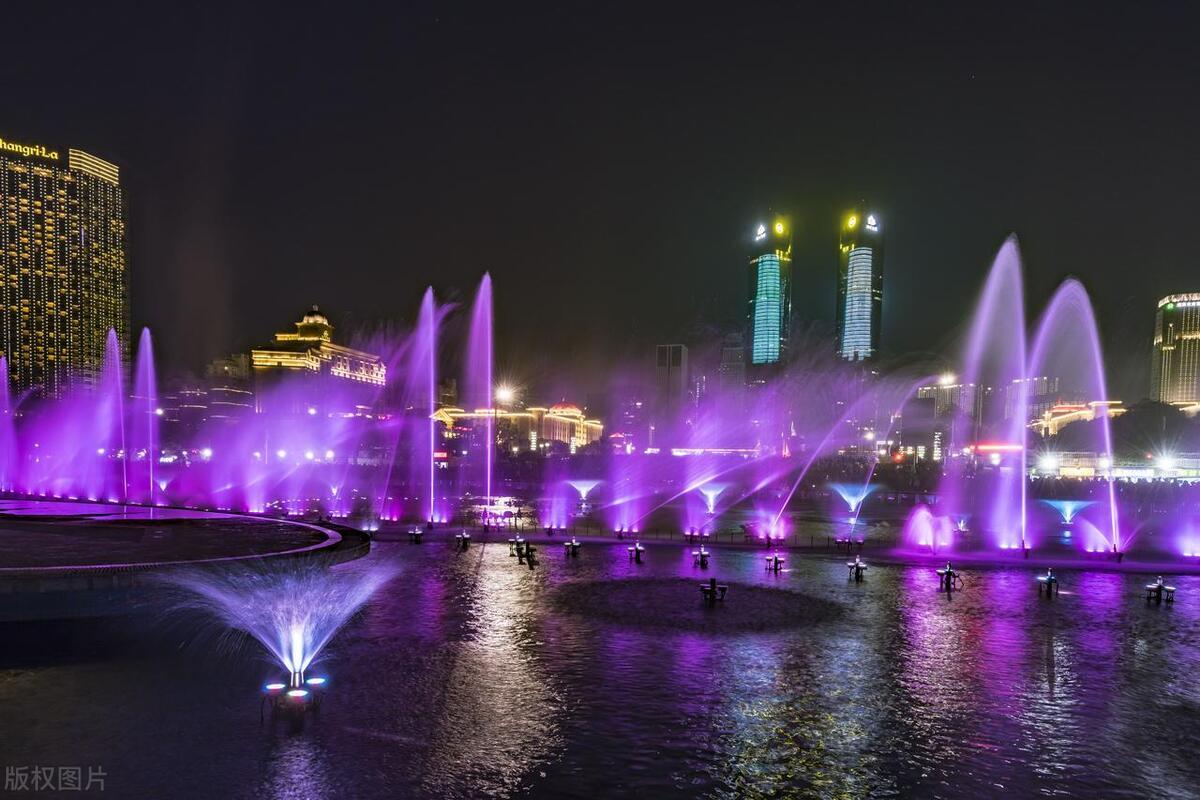 晚上喷泉随着音乐变幻起伏,美轮美奂。