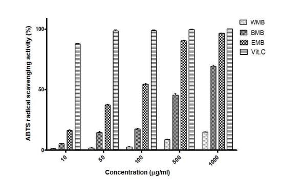 其中试验中以甲醇提取白及提取物溶解(图注EMB)的清除效率接近维生素C,有着不错的御氧化作用。图示WMB\BMB为水溶剂及醇溶剂的白及提取物,也有不错的御氧化效果。[3]