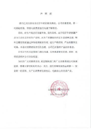 2024年11月23日凌晨,旺旺集团发布声明:我司已关注到有关旺仔牛奶的相关舆论,公司高度重视,第一时间赴现场,积极与消费者进行沟通了解情况。同时,对生产线进行全面审查,没有异常。 [71]