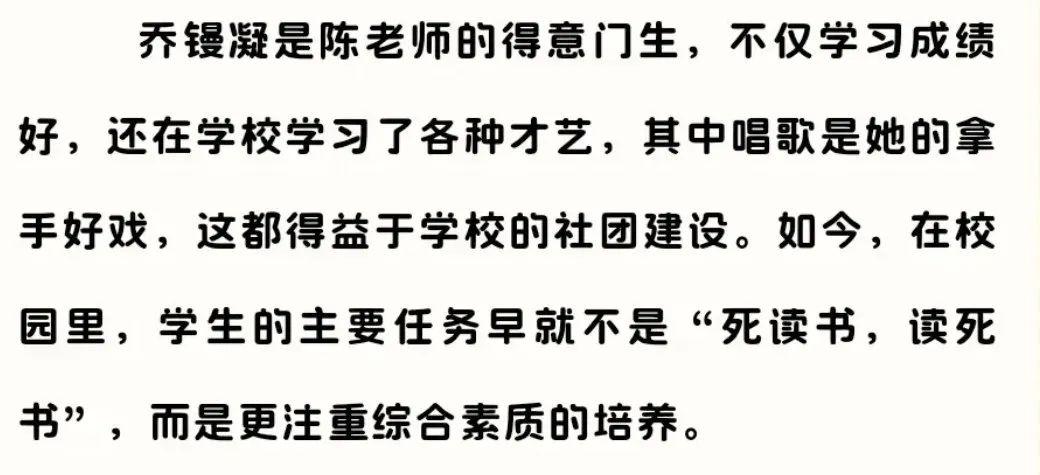 翻看乔镘凝初中时的采访,确实不算瘦,在记者介绍她的介绍词中可以抓取到一个信息:老师的得意门生,不仅学习好,还会唱歌。