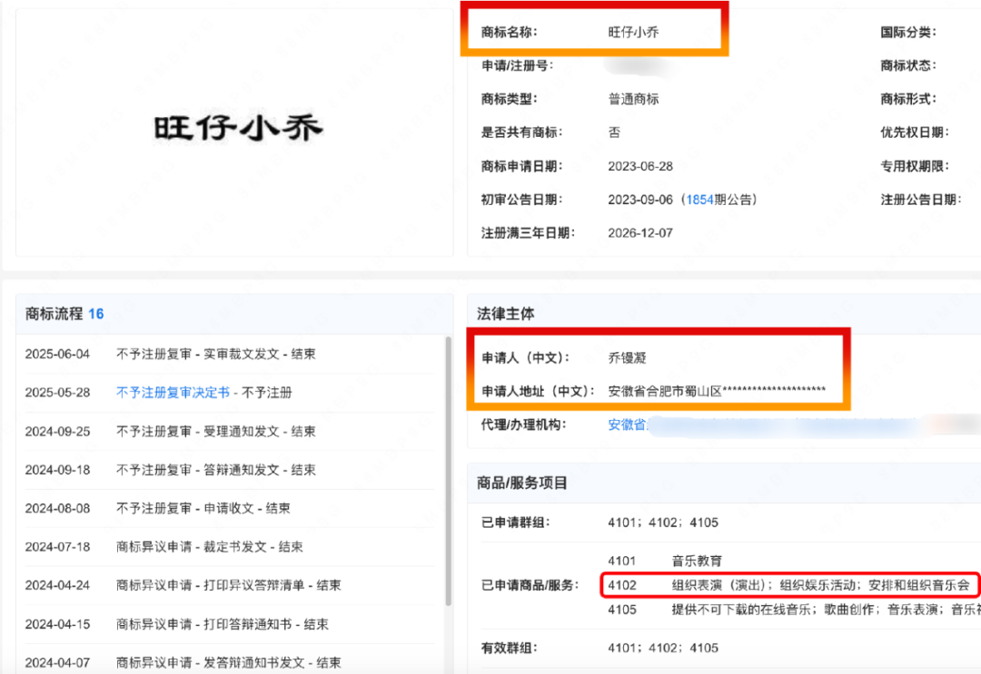 据企业信息查询工具显示,乔镘凝曾申请注册3枚“旺仔小乔”商标,分别涉及了广告销售、教育娱乐、组织表演(演出)、组织娱乐活动、安排和组织音乐会等类别。