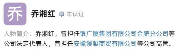 在企业查询中能看到,乔湘红是安徽镘凝商贸的公司高管,还曾担任过银广厦集团合肥分公司法定代表人。