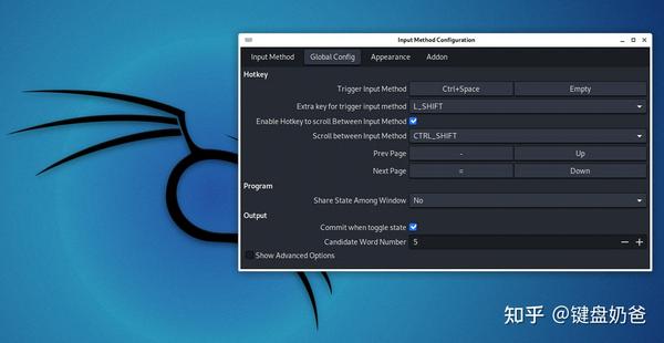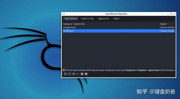 安装输入法框架后,会有对应的输入法配置。经过对比比较,还是在WSL的Kali操作系统上,安装了基于Fcitx的谷歌输入法、五笔拼音输入法。