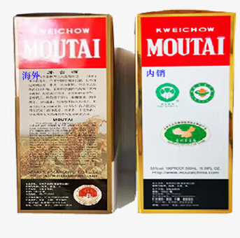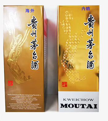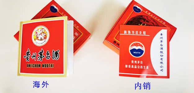 海外版的外盘侧面有中英文注释、内销茅台外盒侧面没有。
