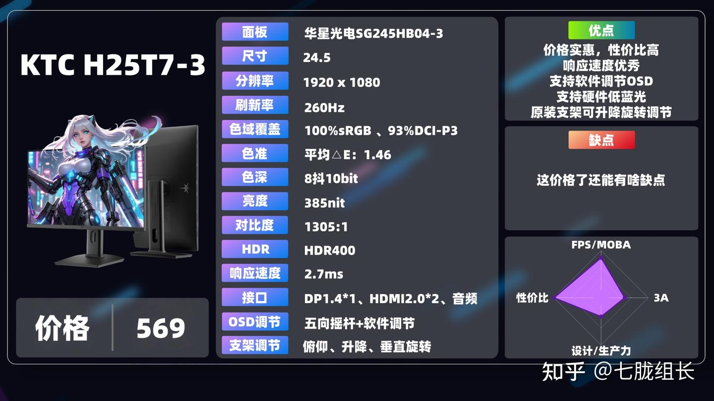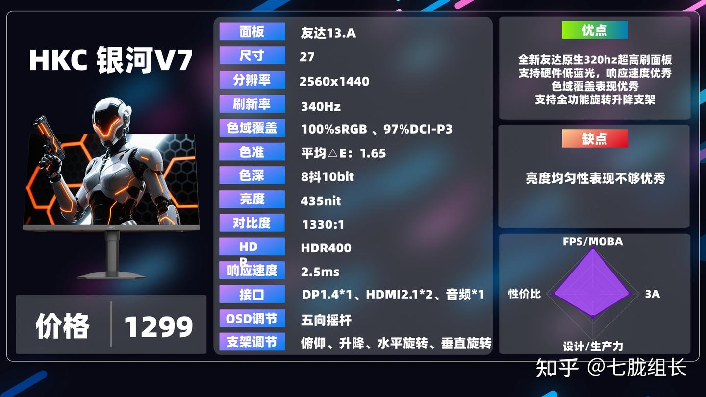 2K全新面板规格来咯~,HKC的2K超高刷新品 银河V7,搭载了友达的2K超高刷新面板13.A 原生320Hz Fastips面板,并且超频到了340Hz,这参数,目前售价只要1299,可以说是相当之卷中卷了(目前反100E卡)显示素质方面 色域覆盖非常优秀100%sRGB、97%DCI-P3,支持硬件低蓝光,拥有出厂校色 sRGB模式下平均色准1.65。 电竞素质方面自然也是不用多说了,最佳OD档位快速下 响应速度2.5ms 相当的极限,外壳模具方面 依然是HKC比较家族式的外观,颜值也就那样吧,但原装支架给到了全功能调节的满血旋转升降支架,并且还是对桌面空间占用较小的六边形底座,相当nice