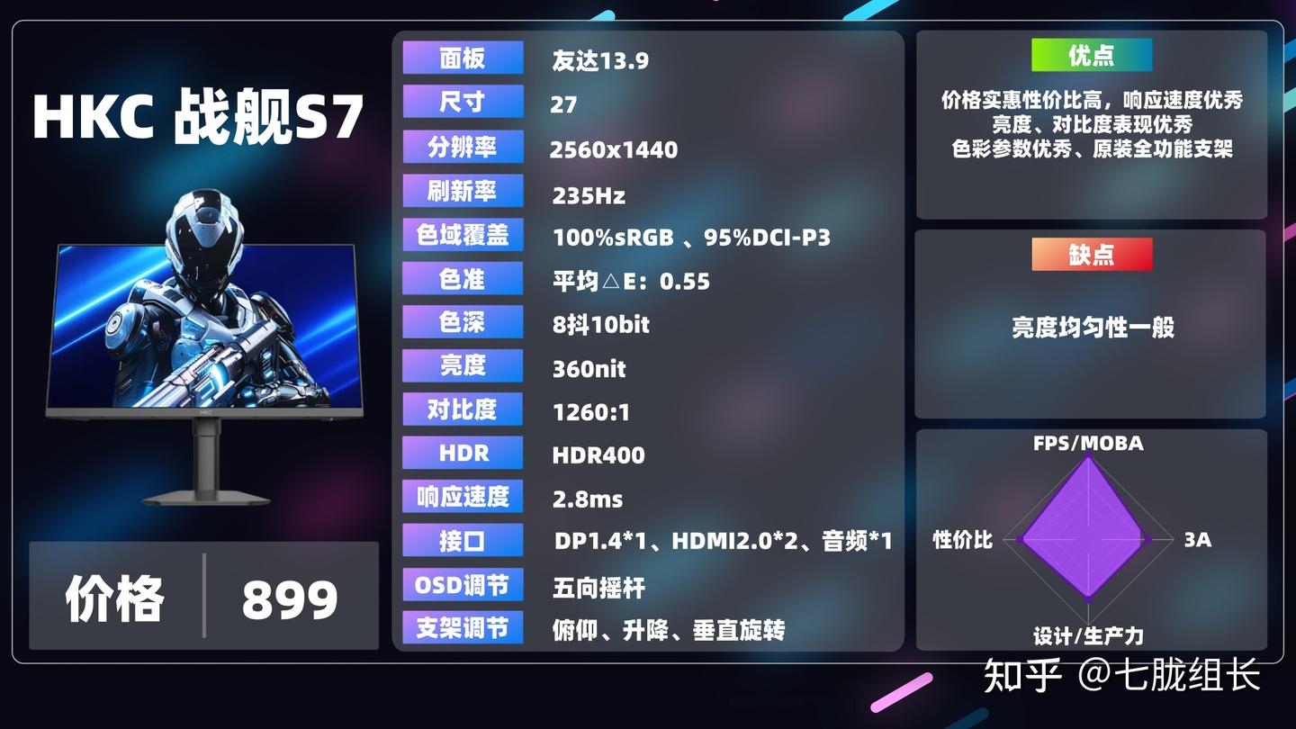 HKC的2K高刷新品,战舰S7,搭载友达的新面板13.9,原生2K 200Hz,超频至235Hz使用,游戏表现方面可谓是非常强了,OD快速档位下,平均2.8ms的GTG响应时间,且过冲率仅为5.7%,这个响应速度已经是顶级T1的水准,接近IPS的极限调校了,在其他的色彩参数方面战舰S7也是给的很卷,100%sRGB 95%P3,SDR 360nit HDR450nit ,并且给到的原装支架还是多功能旋转升降支架,唯一的缺点的部分可能就是亮度均匀性一般了,不过电竞定位的显示器普遍也都是这么个表现,整体来讲战舰S7在8~900这个价位段的性价比 算是非常高了,2K高刷的性价比首选之一