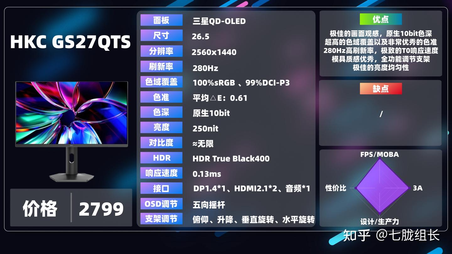 HKC GS27QTS在整体的显示素质方面,可以说没有缺点,极佳的色域覆盖和OLED面板带来的近乎于无限的对比度,让OLED的画面观感是非常出色的,并且面板特性带来的极致 接近于0的响应速度,对于电竞玩家来讲观感提升也是巨大的,完全不存在拖影鬼影,短TTK FPS高玩狂喜,如果你的预算能够到HKC GS27QTS的价格,想要体验一把 毕业级显示器的观感,HKC GS27QTS会是一个不错的选择