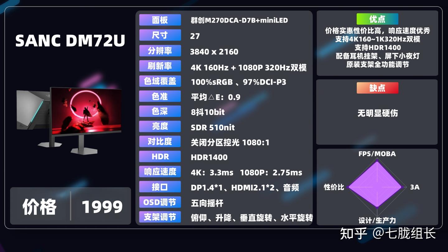 SANC DM72U是搭载miniLED背光的4K双模切换高刷屏,不同于常见的友达7.6面板,它使用的是群创的D7B面板,面板的表面雾都相比友达7.6会更低一点,观感上会略微更加通透一些,外壳模具使用的也是SANC家新的暗夜武士,依然有SANC祖传的耳机挂架和屏下小夜灯,原装支架也做到了支持水平旋转调节的全功能支架,模具素质和颜值是要好于上面HKC G27H7 PRO的,显示素质方面也没啥可挑剔的点,响应速度表现不管是4K还是1080P默认都是T1水准,如果你对HDR观影和HDR3A游戏体验有更进一步的追求,那么HDR1400的DM72U就是个不错的选择了
