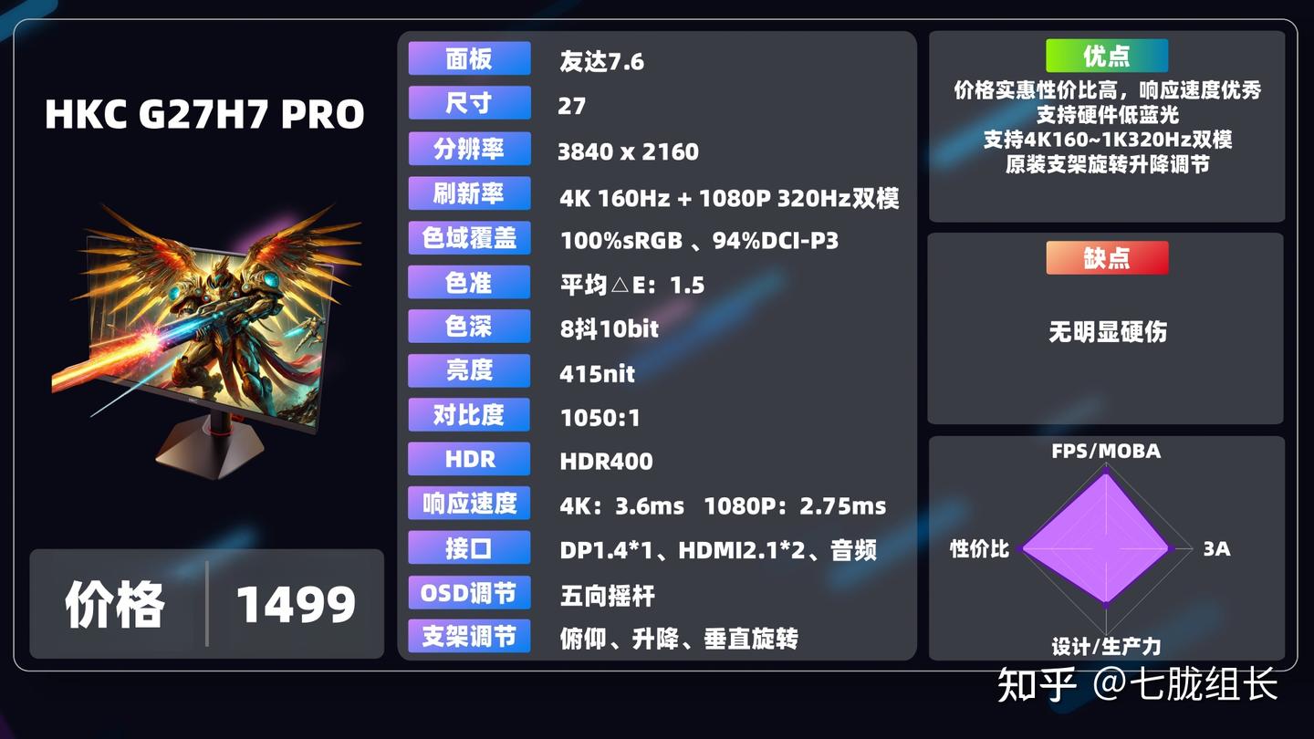HKC G27H7pro,使用友达7.6面板,支持4K 160Hz和1080P 320Hz双模切换,100%sRGB,94%DCI-P3色域覆盖率表现优秀,色准表现也非常不错,sRGB色域缩限不错,且色温伽马都贴合标准值,能兼顾轻度设计类需求使用,亮度激发和对比度也都在水准之上,4K/1080P下的响应速度都在T1梯队,整体表现非常均衡