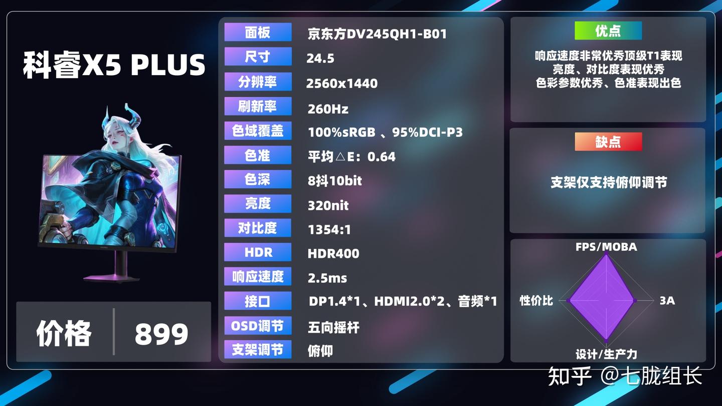 科睿小屏2K高刷的新品,X5Plus的显示素质表现,可以说是小屏2K高刷里的小全能王了,游戏素质方面OD快速档位下仅2.5ms,相当的优秀,色彩参数方面100%sRGB 95%P3自然不用多说了,sRGB模式下的色准均值0.64,最大值也只有1.54,色准表现非常好,并且他的sRGB色域缩限表现非常不错,sRGB模式下能达到98.6%的色域覆盖,再加上X5Plus的亮度均匀性表现很好,这台显示器除了打游戏是一把好手外,你拿来搞一些设计创作需求也是完全可以的,X5Plus整体在显示素质方面可以说是做的相当不错了,很六边形,缺点嘛就是原装支架只有俯仰调节,如果你是比较喜欢小尺寸屏幕,想要更加细腻的画面观感,X5Plus是一个不错的选择,更建议搭配个支架臂使用,那就真满血了